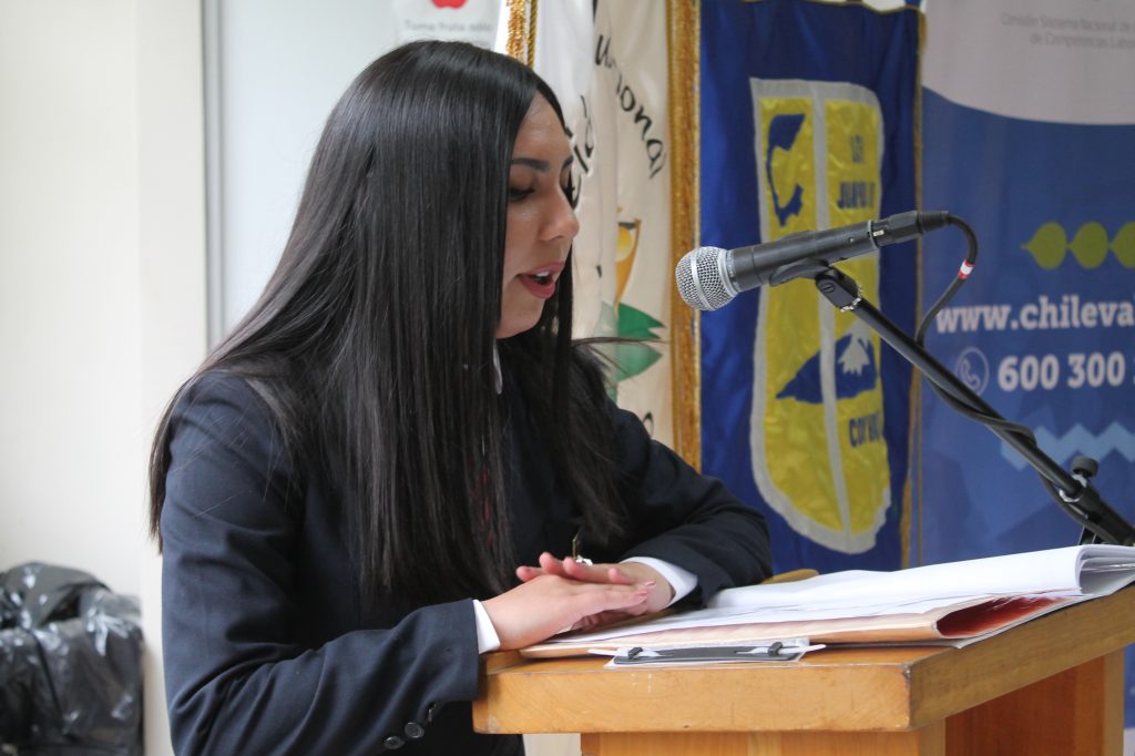 En esta oportunidad, los estudiantes de la especialidad de Obras Viales recibieron la certificación como “Maestro en Carpintería de Obra Gruesa”. A nombre del grupo, una de sus compañeras expresó con emoción: